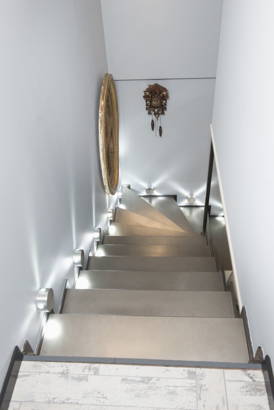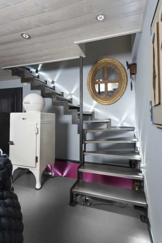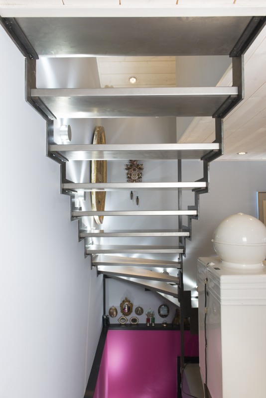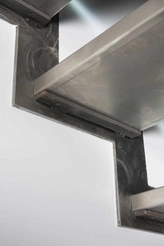 Escalier double limon extérieur en crémaillère acier brut avec habillage marches en inox brossé.