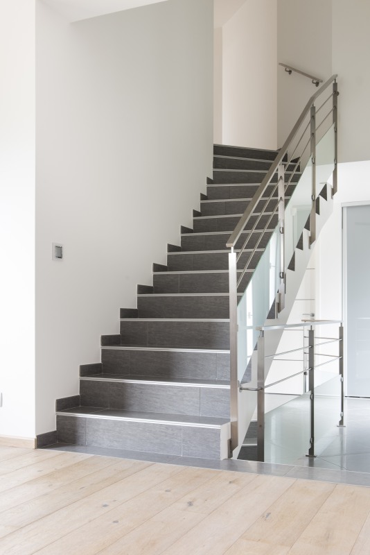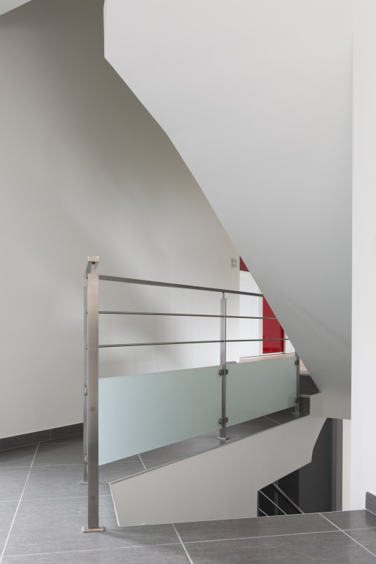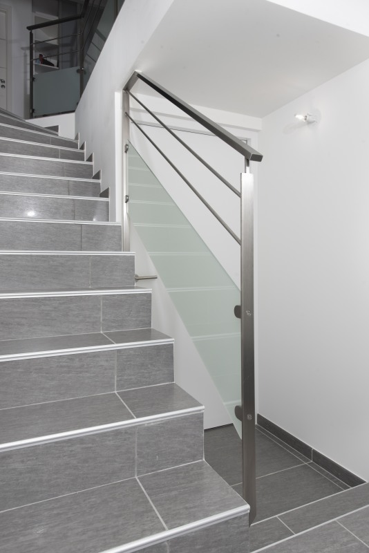 Garde-corps en inox brossé avec partie basse en verre opale.