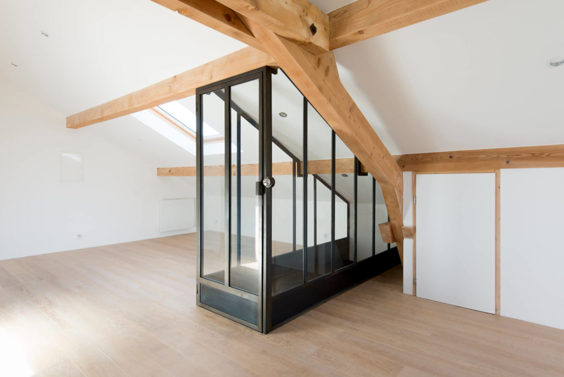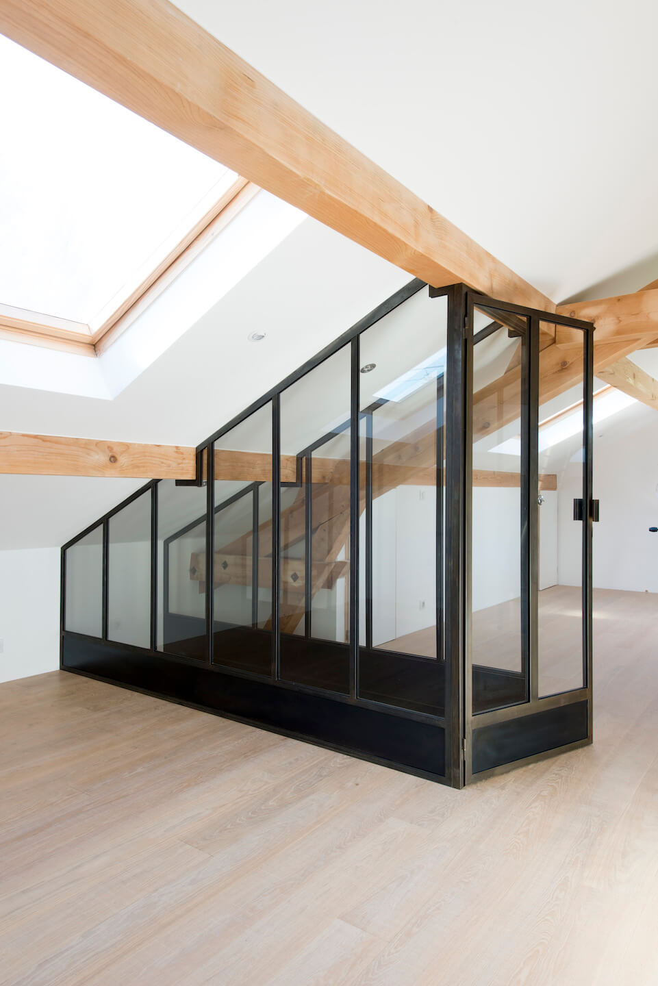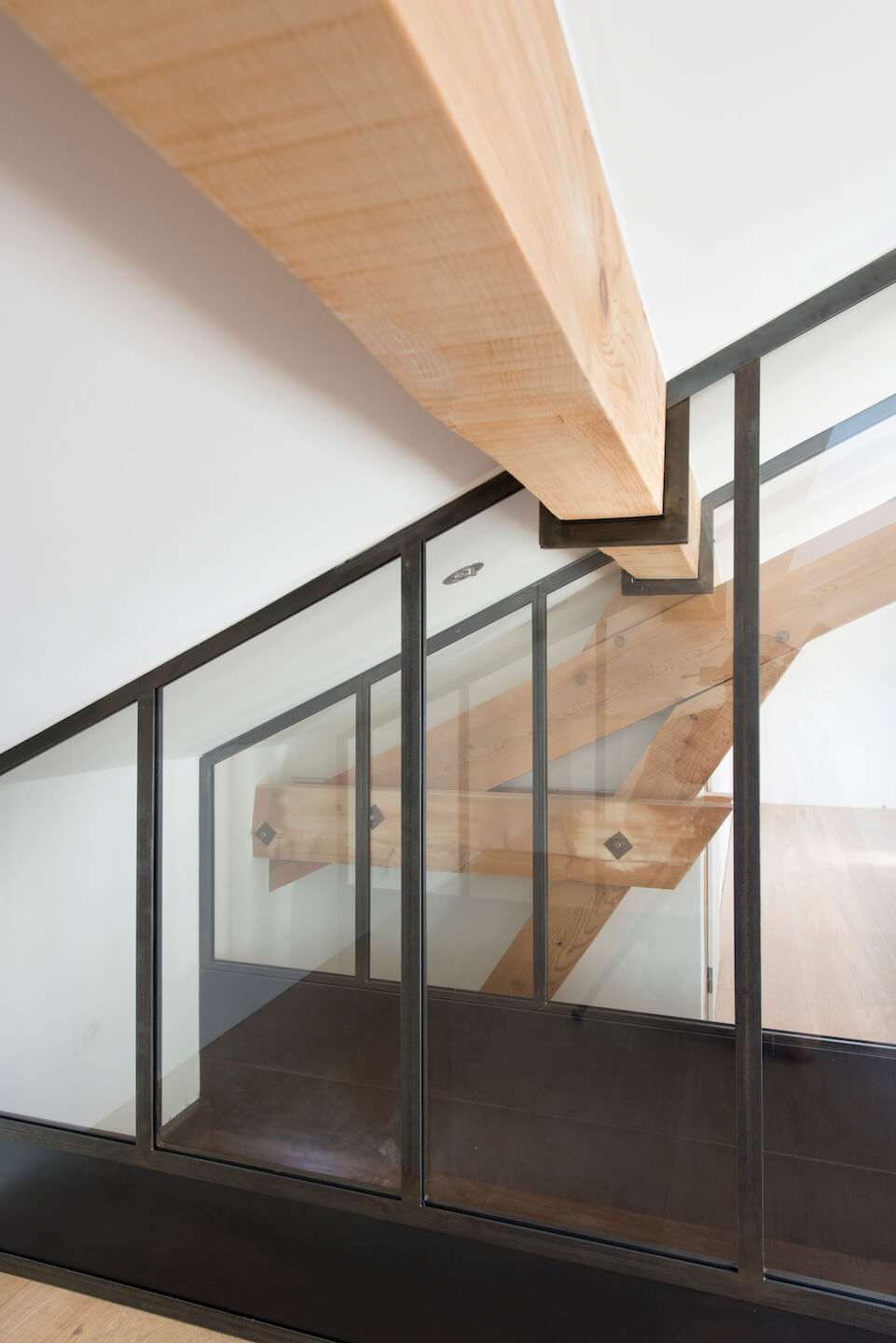 Paroi vitrée en acier brut et verre feuilleté transparent.