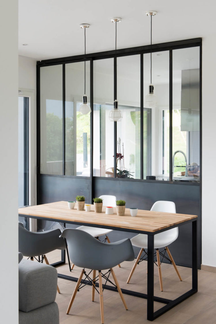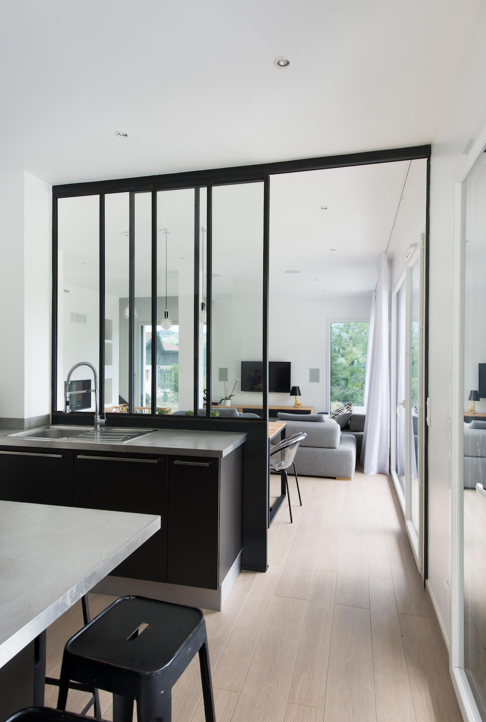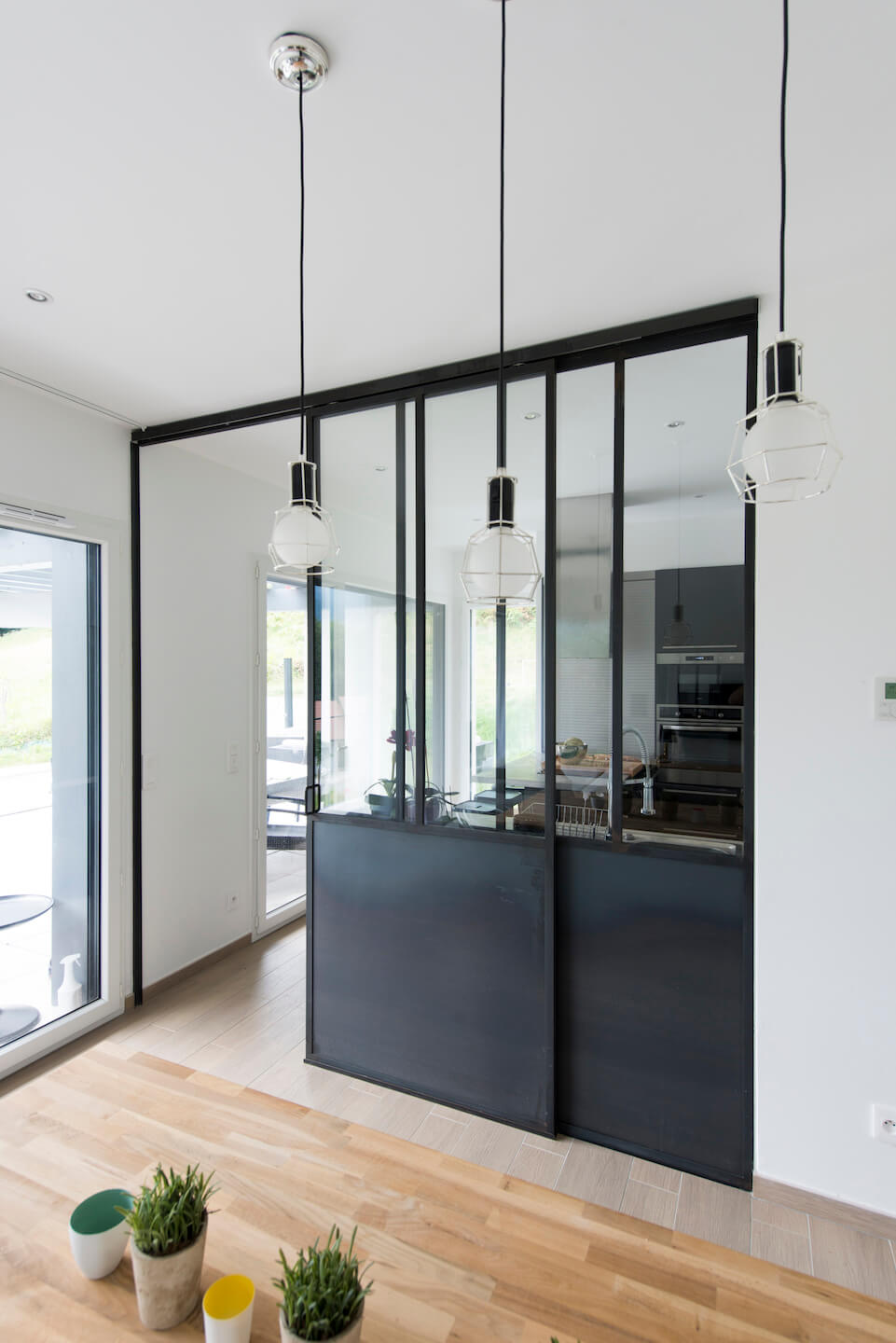 Paroi vitrée en acier brut et verre feuilleté transparent.