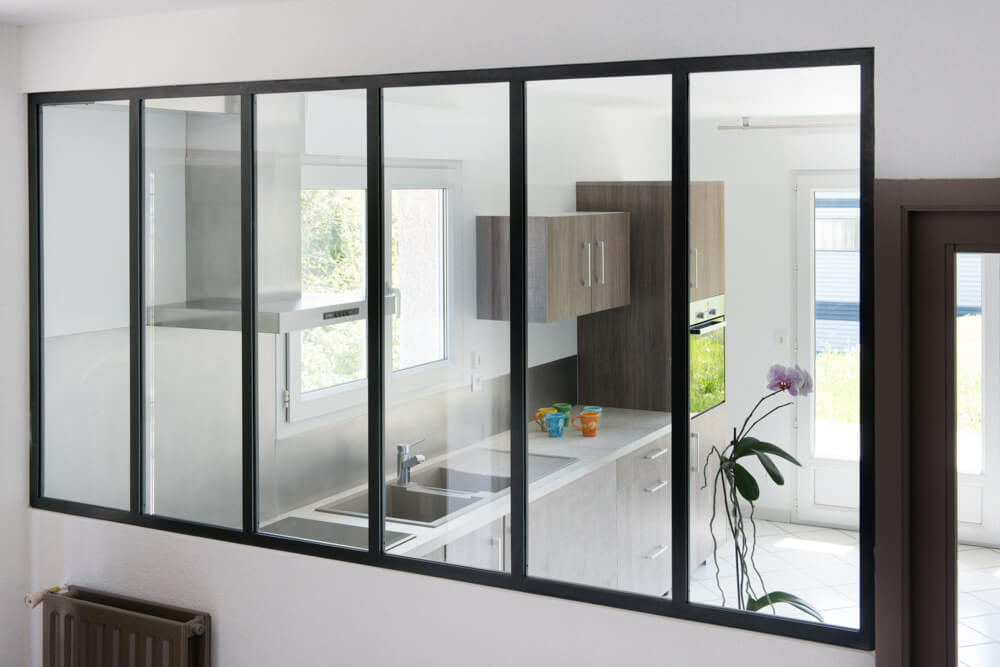 Paroi vitrée en acier brut et verre feuilleté transparent.
